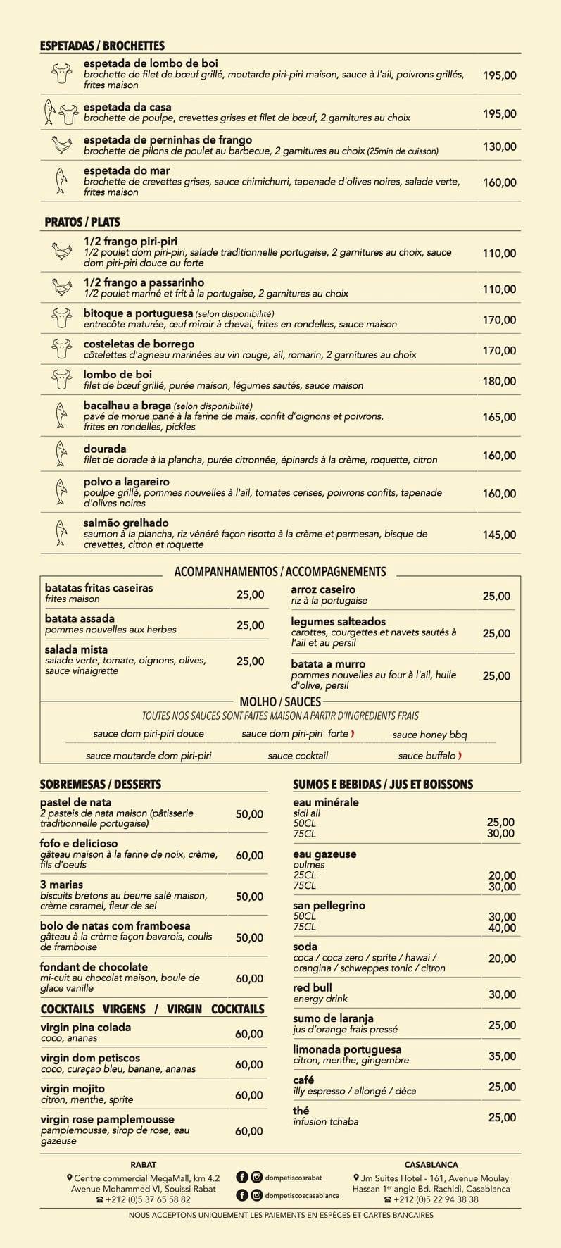 The map on the website doesn’t include the prices, but you can see them on the Facebook page, so I’ve uploaded the two images: first part and second part of the map. With the change, prices have risen sharply (pasteis de nata, for example, have gone from 45 dirhams to 50 dirhams per two), and we are starting to be in a high price range. It’s a shame, the old Dom Piri-Piri combined quality with a moderate bill, and the tapas on offer are, in Portugal, budget dishes.