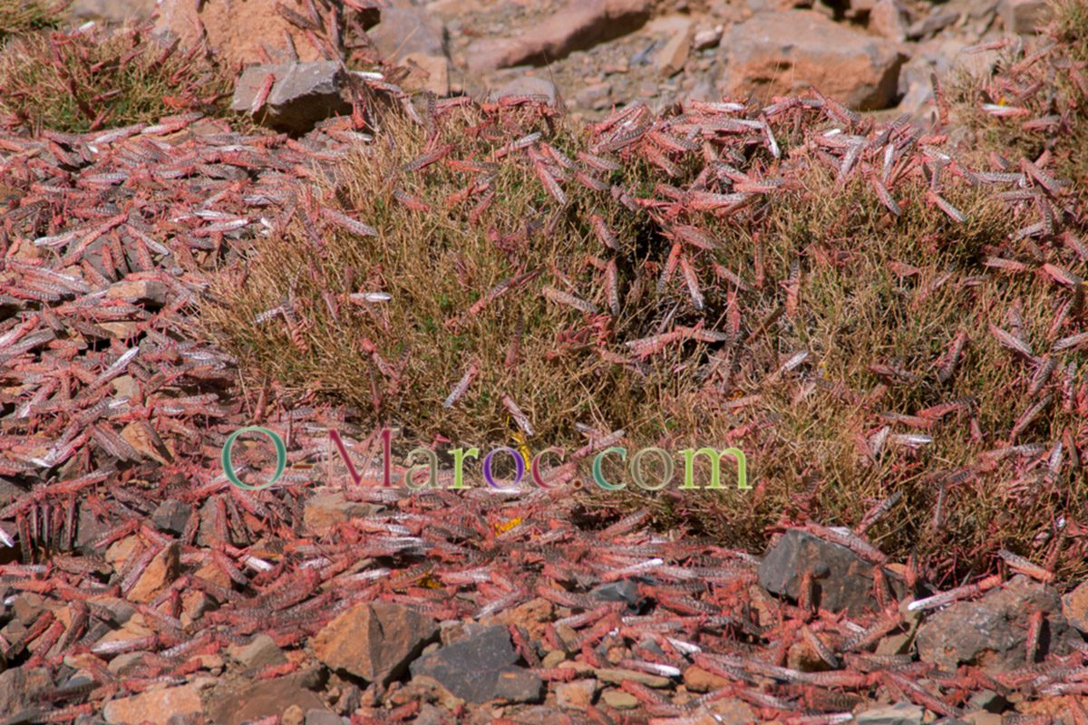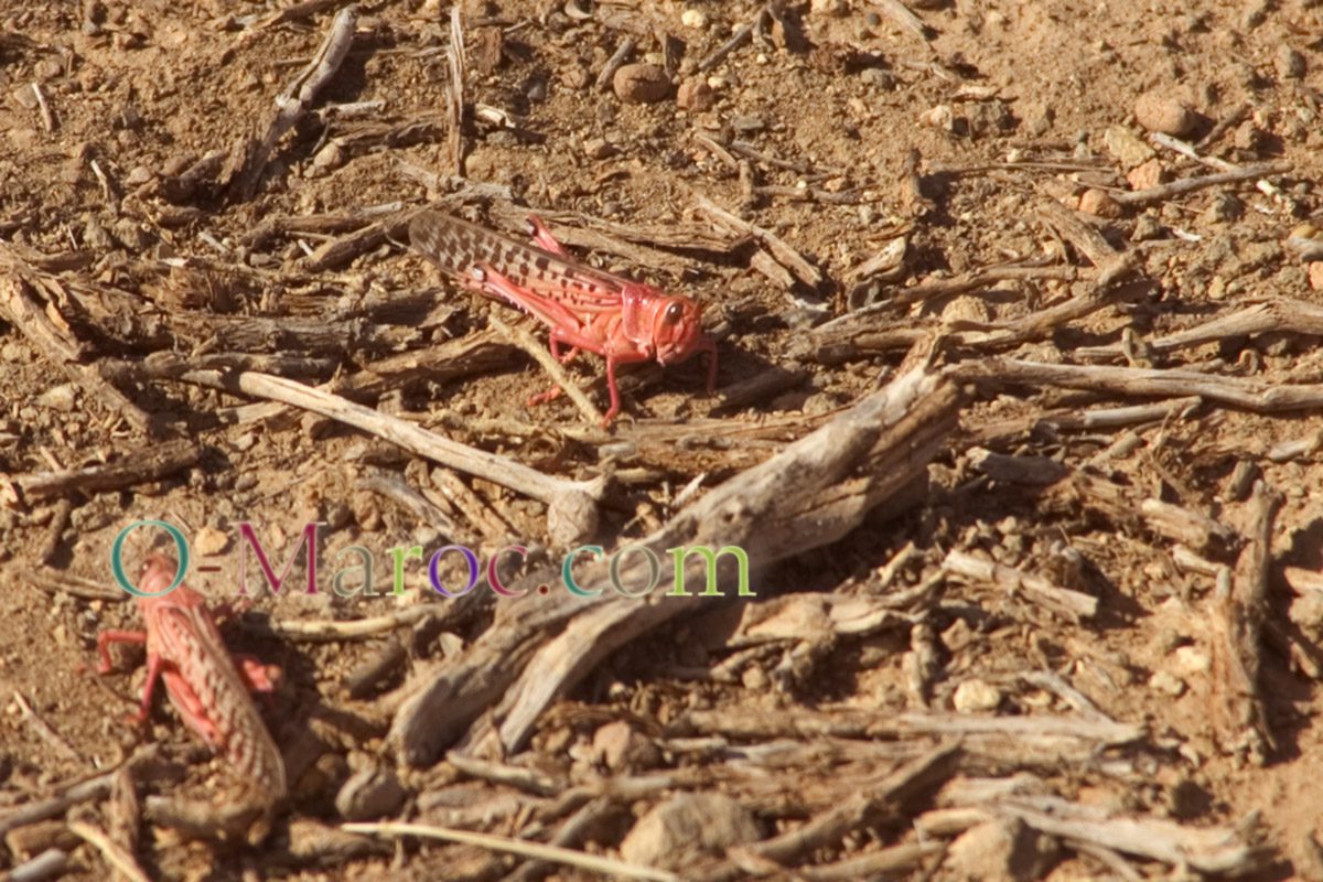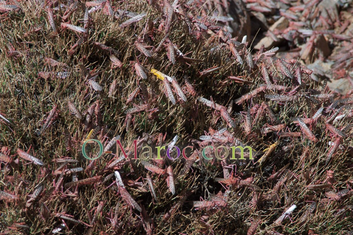 The photos illustrating this article were taken three years ago, on the track between M'semrir and Tamtatouchte. The locusts are red because they have not yet reached maturity. When they have finished developing, they turn yellow.