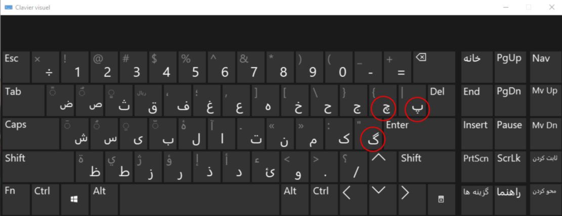 - the ‘V’ is rendered with a Fa surmounted by three dots, like this: ڤ